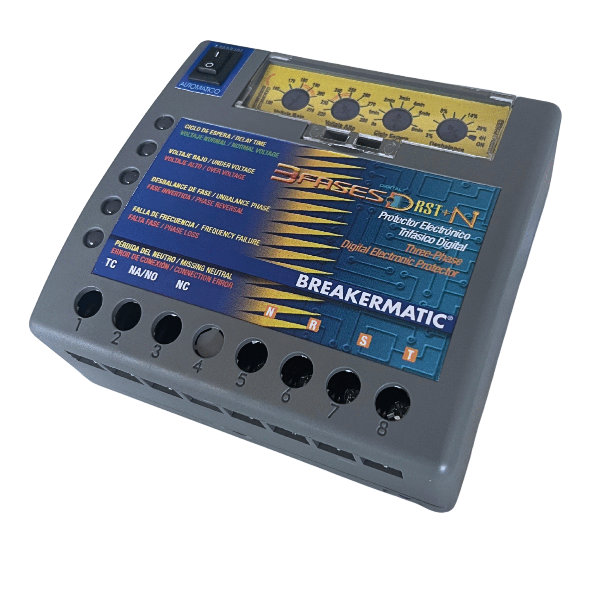 The BREAKERMATIC 3 fases D RST+N is an electronic voltage protector that monitors line and phase voltages in the power supply for a three-phase appliance, protecting it against voltage fluctuations, imbalances, and neutral losses. It also prevents the machine from starting when the direction of rotation dictated by the phases has been reversed or when a phase is missing. It will also disconnect if there is a variation in the line frequency.