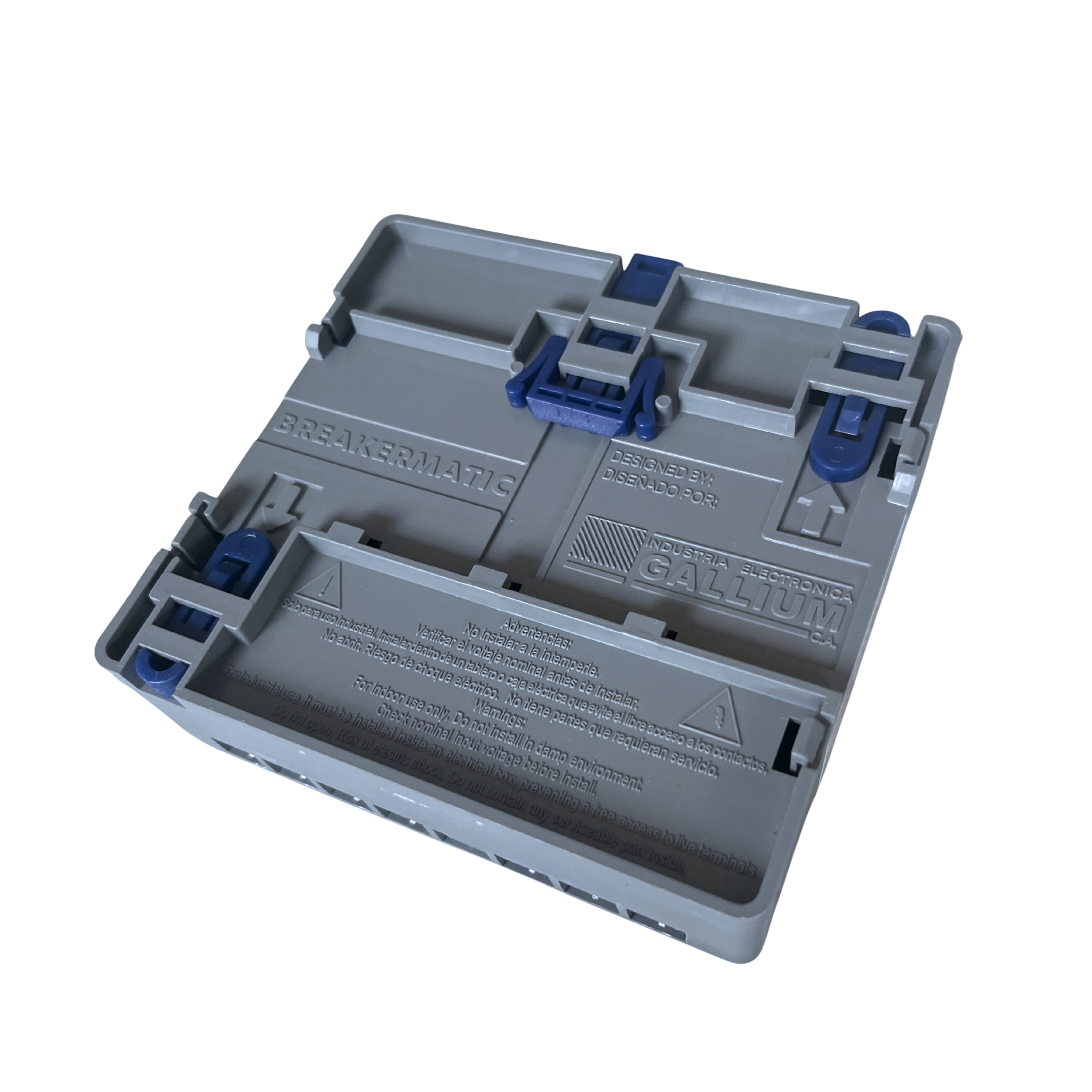 It can be mounted using an omega rail (DIN rail) for electrical panels, or directly to a wall using screws placed through built-in fixing brackets.