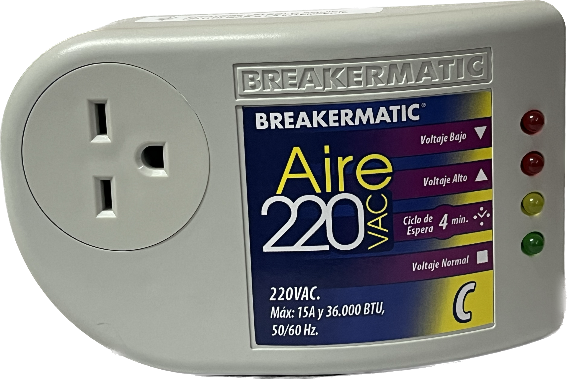 El BREAKERMATIC Aire 220 C es un protector electrónico de voltaje diseñado especialmente para prevenir los daños que un apagón o un voltaje alto o bajo pueda causarle a su equipo de Aire Acondicionado. Es ideal para equipos provistos con clavija o enchufe para la conexión, facilitando la instalación de la protección sin intervenir el equipo.