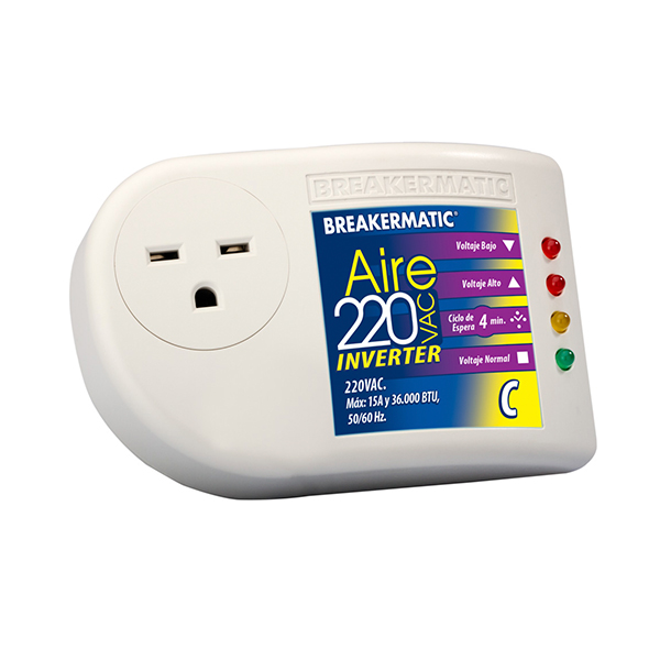 El BREAKERMATIC Aire INVERTER 220 C es un protector electrónico de voltaje diseñado especialmente para prevenir los daños que un apagón o un voltaje temporal alto o bajo pueda causarle a su equipo de Aire Acondicionado de última generación, y previene también daños causados por picos transitorios. Es ideal para equipos provistos con clavija o enchufe para la conexión, facilitando la instalación de la protección sin intervenir el equipo.